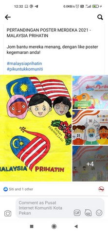 31 Ogos 2021 | Aktiviti TerkiniPusat Ekonomi Digital Komuniti Kota Pekan telah mengadakan kolaborasi bersama PIK Btg Melaka untuk Pertandingan Poster Merdeka 2021. Pertandingan ini diadakan sepanjang Bulan Ogos dan pengumuman pemenang diadakan pada 30 Ogos 2021. Peserta perlu menghasilkan poster bertemakan kemerdekaan dan menghantar penyertaan mereka secara online kepada Pusat Ekonomi Digital . Penghasilan poster adalah digalakkan menggunakan medium ICT . Aktiviti ini dapat mengisi masa lapang dan meningkatkan semangat patriotik dalam kalangan peserta.