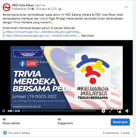 20 Ogos 2022 | Aktiviti TerkiniPada 19 Ogos 2022, PEDi Kota Pekan telah berkolaborasi bersama PEDi Btg Melaka untuk mengadakan sesi Live di Facebook Page PEDi. Live tersebut bertajuk Trivia Merdeka bersama PEDi sempena Bulan Kemerdekaan pada tahun ini. Ini merupakan kesinambungan daripada sesi live yang diadakan sebelum ini. Info-info penting berkaitan Sejarah Negara, Penggunaan Bendera dengan Betul dan Akta berkaitan penyalahgunaan simbol dan lambang kebesaran negara telah dikongsi ketika sesi live ini. Sesi ini dapat meningkatkan pengetahuan para penonton dan meningkatkan semangat patriotik dalam diri mereka.