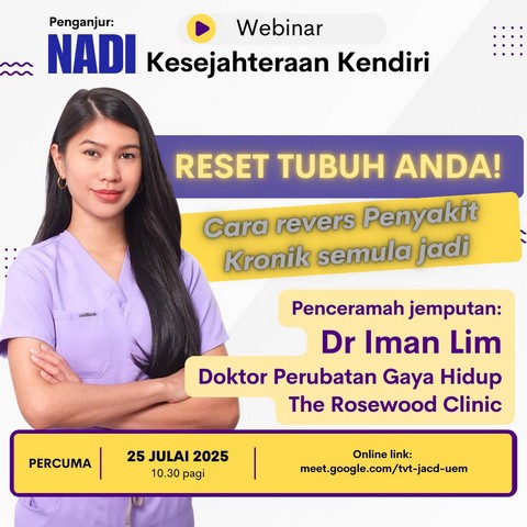 Pada 25 Julai 2025, telah berlangsung webinar kesejahteraan kendiri bertajuk Reset Tubuh Anda ! Cara Revers Penyakit Kronik Semula Jadi. Ramai yang tidak sedar, penyakit kronik seperti darah tinggi, kencing manis dan kolestrol boleh dicegah dan dikawal bahkan direvers ! Bukan hanya ubat semata-mata. Perkongsian bersama Dr. Iman Lim ini memberi kesedaran kepada penonton untuk mengubah gaya pemakanan bagi mendapat gaya hidup yang lebih sihat.